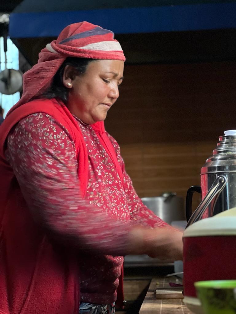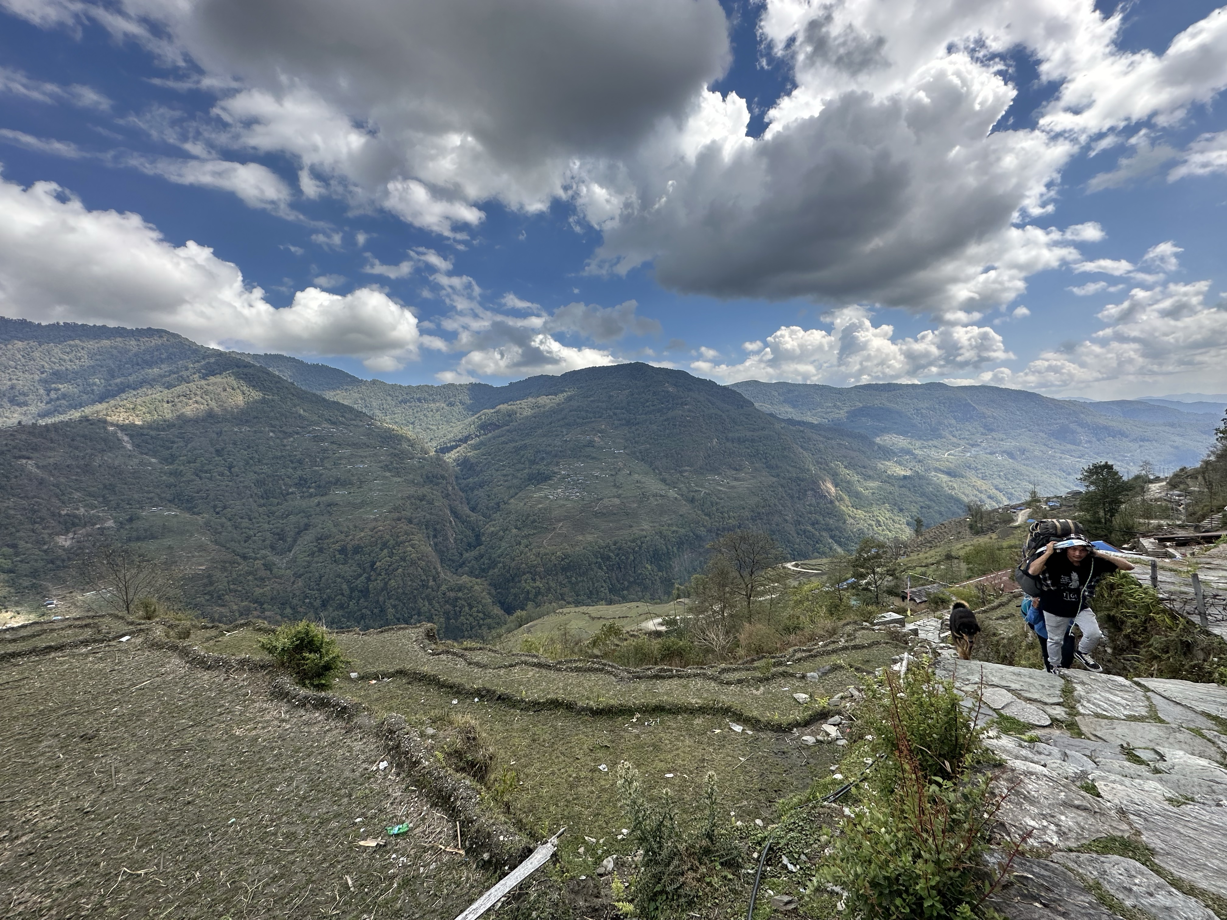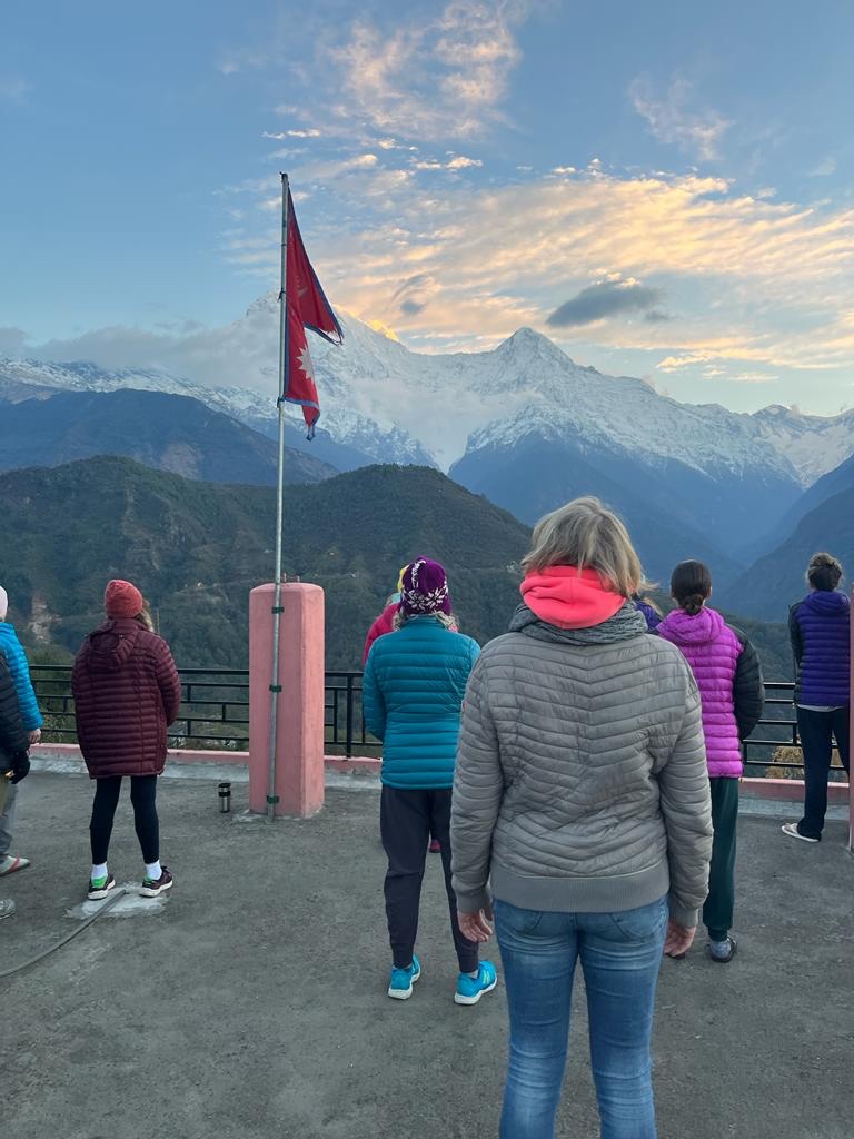 We began our journey with a three hour hike up miles of never ending stone steps, while porters carried our belongings in 40 pound bags by straps across their foreheads. We had a delicious and filling traditional Nepalese lunch of dal baht (purported to be perfect nutrition for hiking at altitude) with refills until you were satisfied. The cook, Lita, was a woman of beautiful, happy energy who oozed love with her infectious smile and laugh and threw together this meal for 20 with calmness and joy. Someone reported we had hiked somewhere between 95-117 floors at that point.