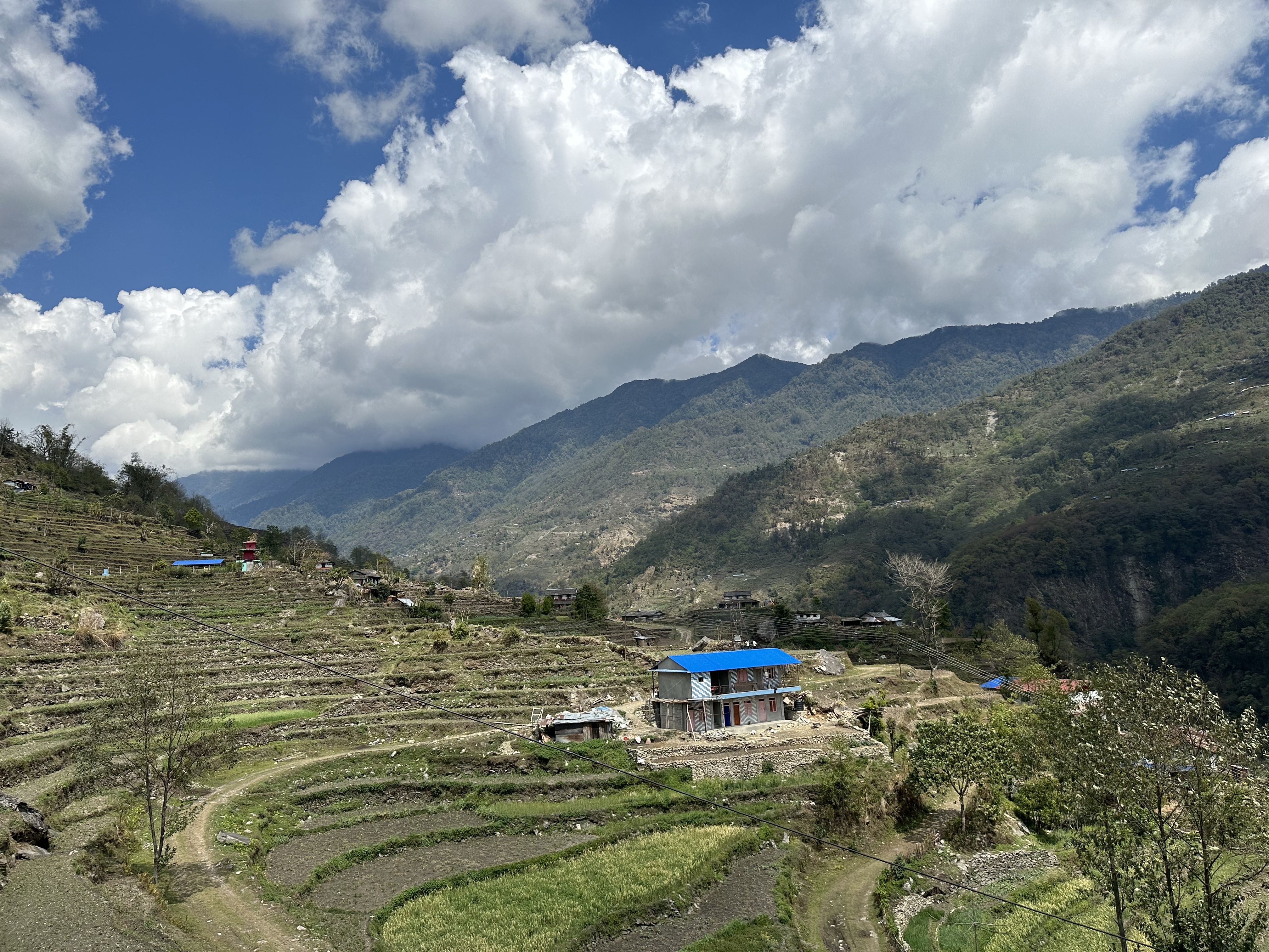 We left Pokhara by bus and traveled up the mountains through switchbacks with breathtaking views. Steep slopes terraced for rice crops and used for grazing by livestock after harvest, large rocks plopped into the road by landslides, mountain slopes bowing into the valley, dotted with village homes, guesthouses, and simple hotels.