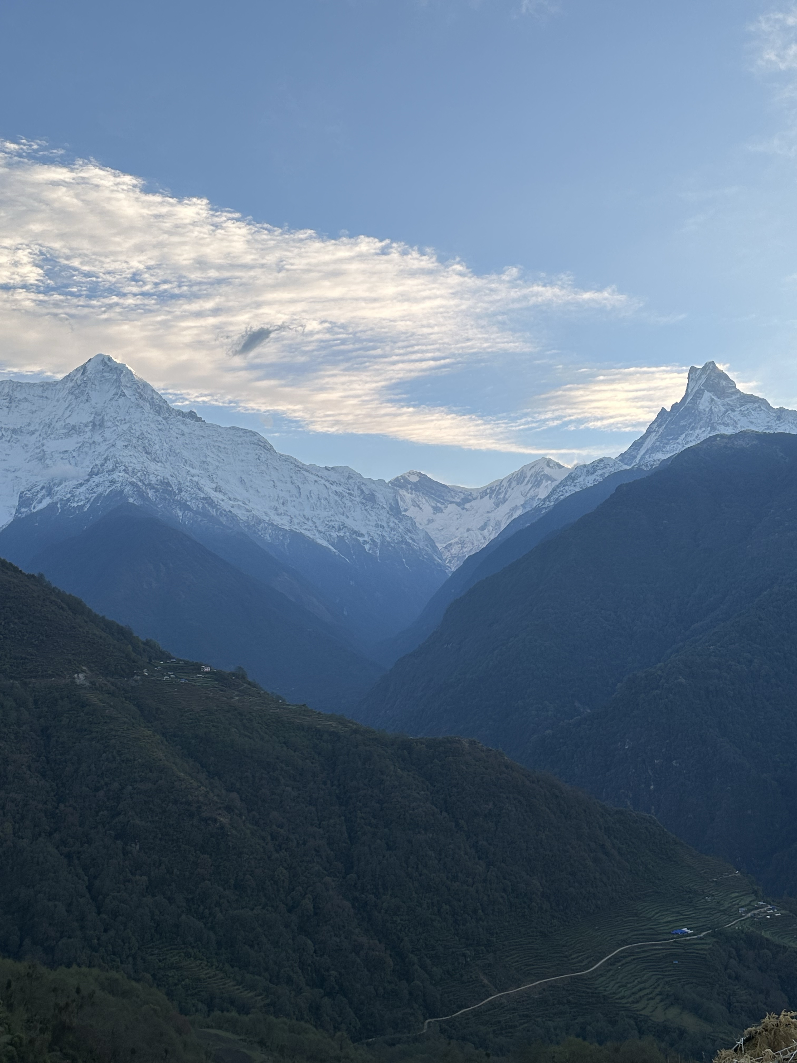 We did double that distance after lunch, heading out just as the skies opened with a cold cleansing rain which continued almost to our destination: a hotel on the steep slope of Ghandruk, overlooking snow capped peaks. If the trip ended today, I would feel like it was worth it. But there’s still more to come. We landed at 6000 feet above sea level.