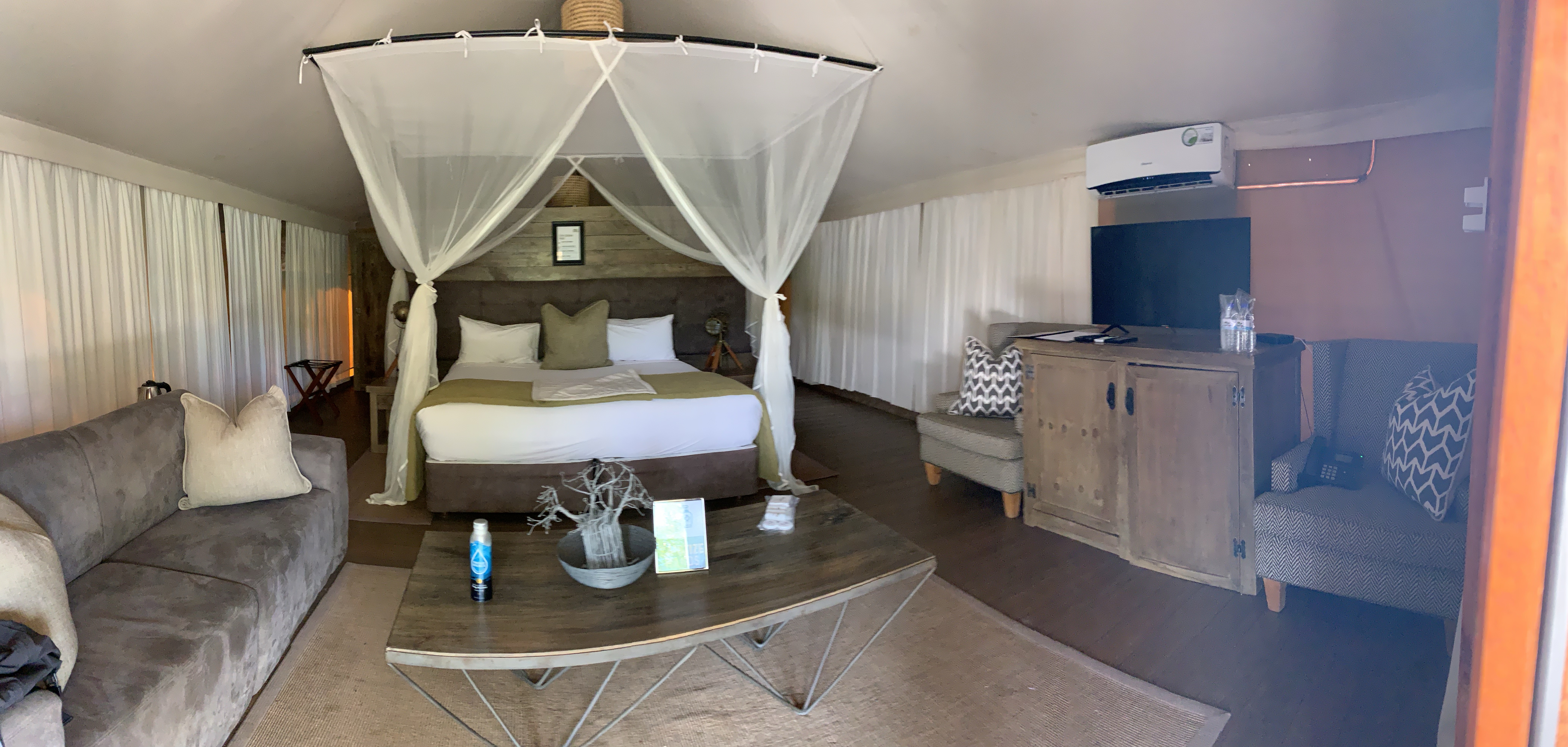 The thing about lodging in a game reserve is that you get to hear the game at night, like the baboon just off my deck calling to someone! The buildings are not fenced off so the game could come right onto the deck if they chose. Some critter scampered across the tent roof (these are glam tents with electricity, chandeliers, a deep tub, AC and tv, not our usual camping tents), and another little creature sneezed just outside my wall.