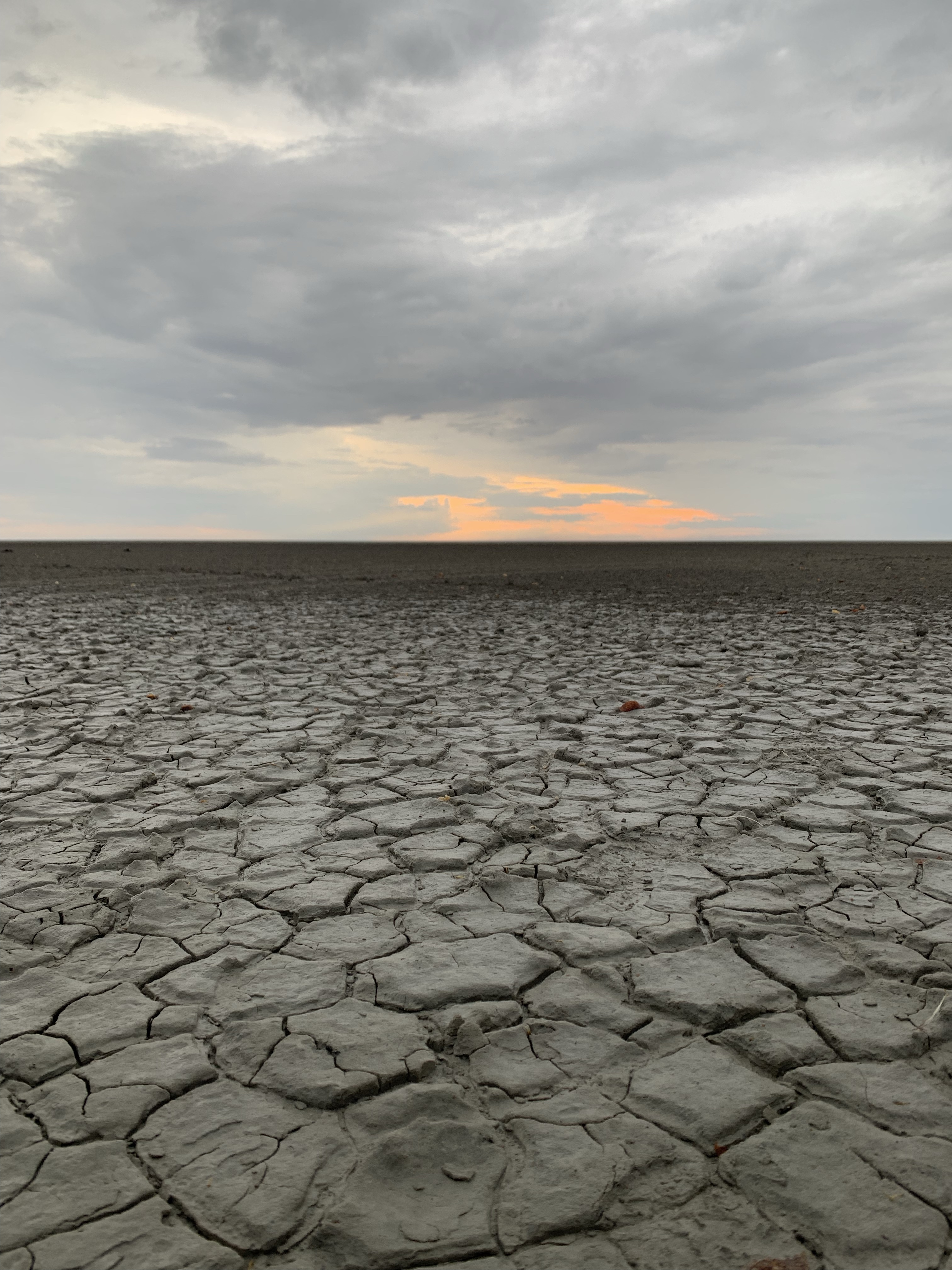The pans look like an ocean of mud flats and are normally covered in salt water but right now they are more like a clay desert. I walked out about a mile onto them, the grey-brown clay becoming increasingly slipperier the further I went, clinging to my sandals like mini weights, a thunderstorm building on one horizon, and a creamsicle sunset on the other.