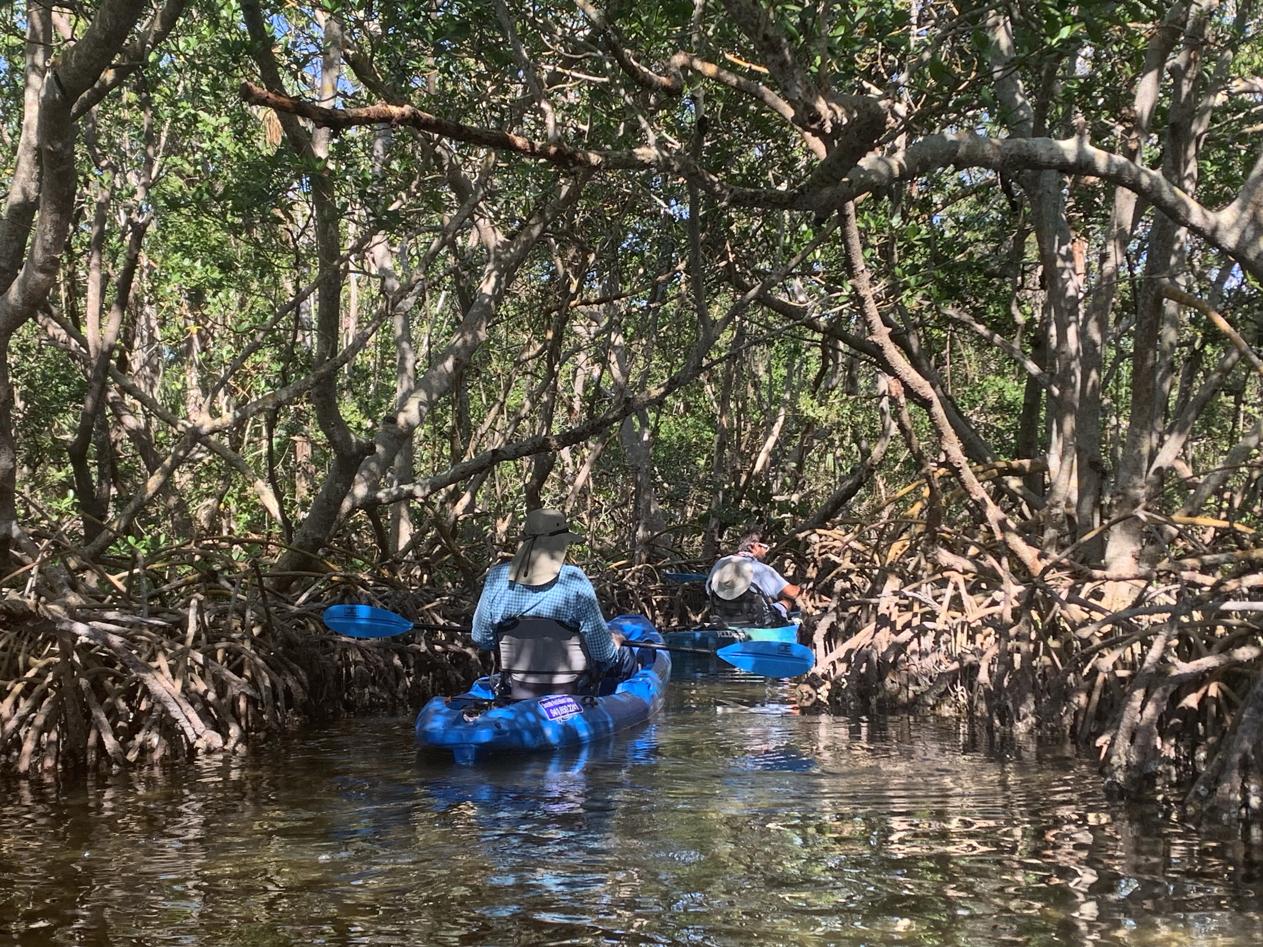 The paddle through the mangrove trails (also known as tunnels) reminded me of walking through a forest. The lovely foliage seen from open water gave way inside to a magical canopy, a forest of slender naked trunks, and endless tangle of roots.