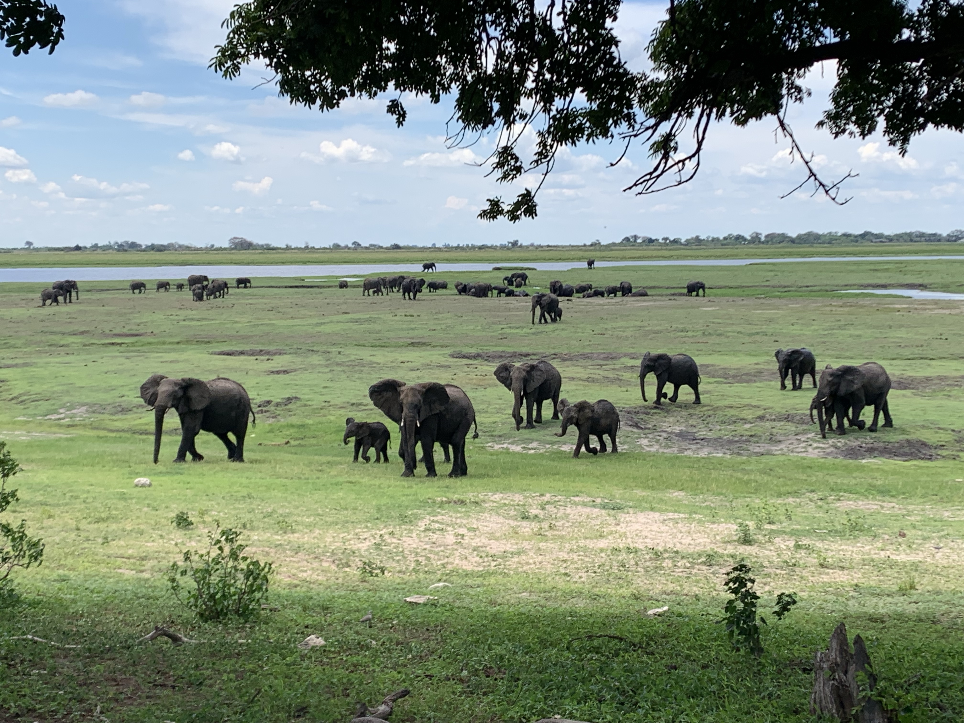 After a smooth and uneventful crossing back into Botswana we set up camp in a town called Kesane then went for a 3-hour game drive through Chobe National Park. The park is comprised of 12,000 hectares of wild land on the gorgeous Chobe River which acts as a beautiful and bountiful border between Namibia and Botswana. The Botswana side has a fairly steep hill rising off the river, dotted with thorny acacias and scrub while the Namibia side is gorgeous and flat with grass and farmland. In the center of the river are grasslands painted bright green by recent spring rains and devoured by basking hippos and hundreds of lumbering elephants! We laughed at the antics of families of baboons, relished sightings of hundreds of impala, four giraffes, warthogs, a family of banded mongoose, fish eagles, vultures, storks, herons, crocs, butterflies, a Leopard tortoise (they can live up to 150 years and weigh 40 kg), and waterbok. The smell of tropical summer permeated my lungs while throngs of birds decorated the airwaves. There’s one place in the park that looks like a bone cemetery with huge sun-bleached leg bones from elephants and hippos as well as a giraffe skull. That was surreal. The highlight though: being barely ten feet from a juvenile elephant and a mother and her calf. After just reading “The Elephant Whisperer”, which talked a lot about elephant behavior, this was a little closer than I felt comfortable but the driver/guide was confident in his assessment of the situation. It’s incredible that these 10 foot, two+ ton animals can evaporate into the scraggly bush in mere seconds. It was an amazing drive across stunning landscapes and a privilege to see so many animals.